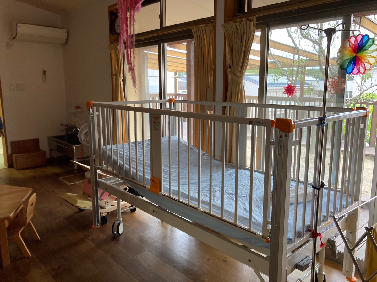 人工呼吸器などの医療デバイスを使うお子さんだと、日中の多くを横になって過ごす場合があります。そのお子さんのベッドは、個別対応の別室ではなくみんなで過ごす部屋の真ん中に配置され、一緒にいる環境が整えられています。